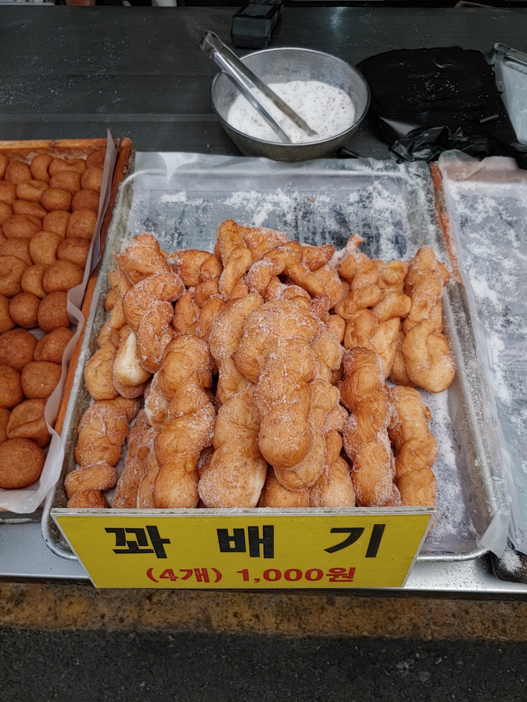 특히 발길을 멈추게 한 곳이 있었으니, 바로 시장의 명물 꽈배기 가게였습니다. 갓 튀겨낸 따끈따끈한 꽈배기 4개에 1,000원! 요즘 물가에 보기 힘든 정말 저렴한 가격이었어요. 한 입 베어 무니 겉은 바삭하고 속은 쫄깃해 순식간에 해치웠네요.
